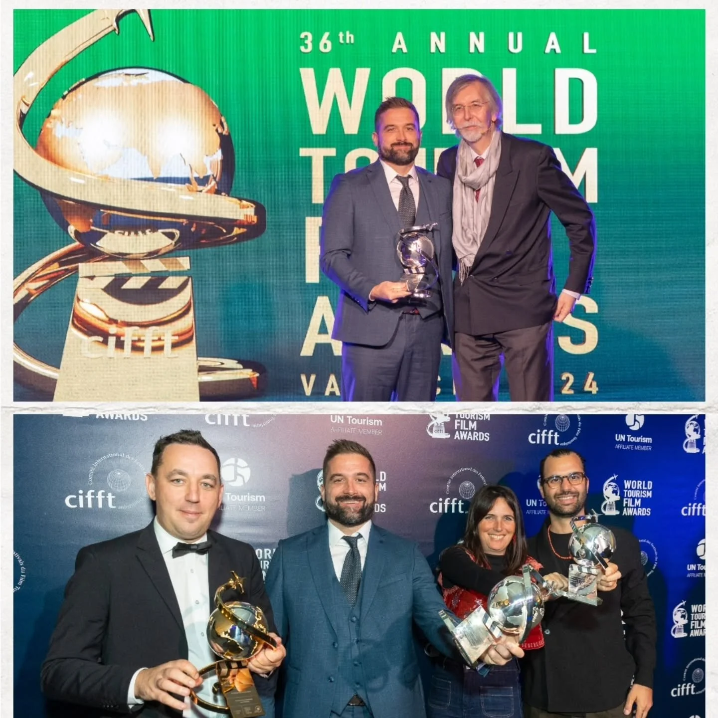 Several film festival laurels and awards, including titles like 'Grand Prix TEF Krk 2024,' 'Best Director TEF Krk 2024,' 'World's Best Tourism Film 2024,' 'Operation 4 Silver Award 2024,' and others, displayed on a black background.